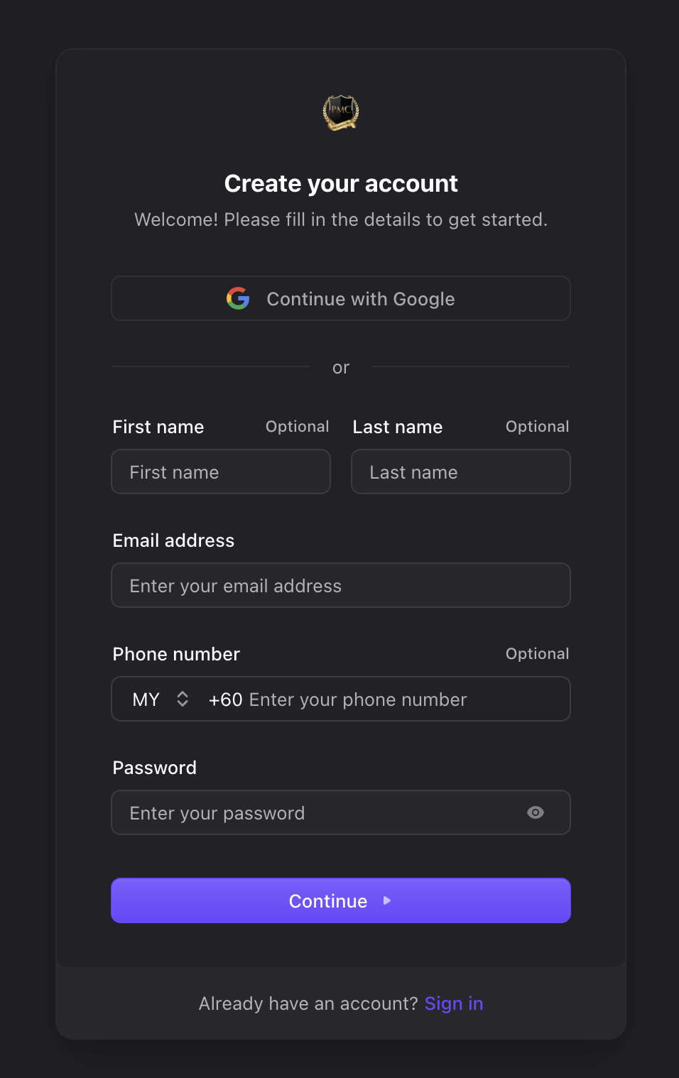 Isi maklumat peribadi. Masukkan nama penuh dan alamat e‑mel aktif. Anda boleh mendaftar menggunakan e‑mel atau akaun Google. Jika memilih e‑mel, cipta kata laluan yang kuat (8 character sahaja). Passkey tidak diperlukan ketika mendaftar.
