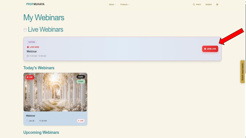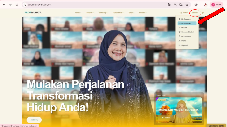 Akses webinar anda. Selepas log masuk, pergi ke Student/Pelajar > My Webinars/Webinar Saya